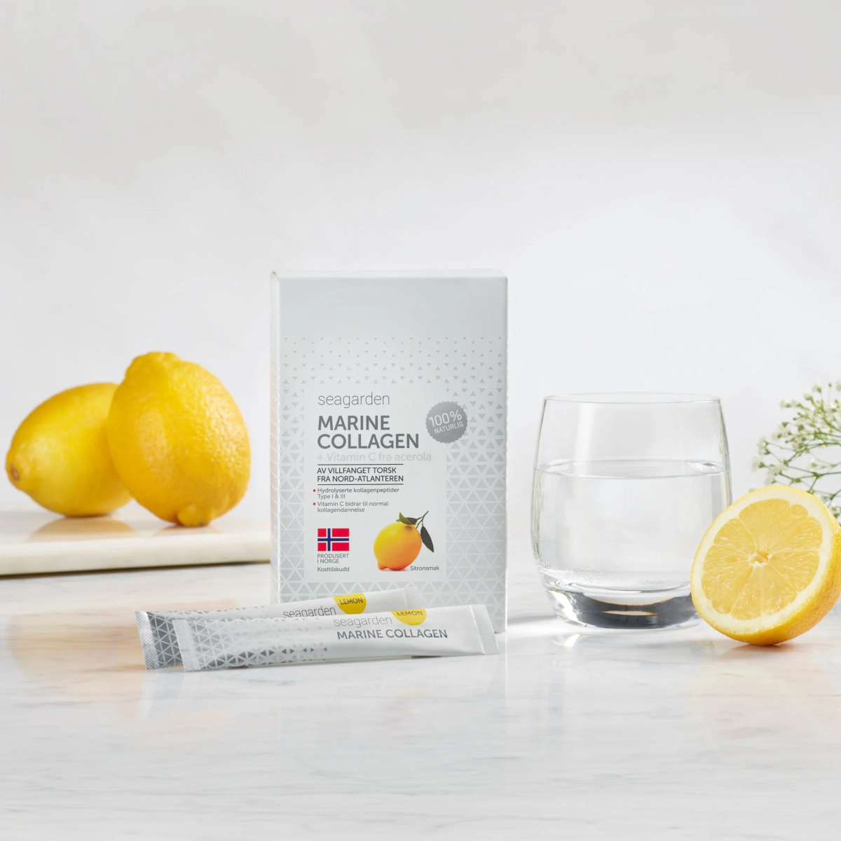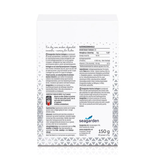 Seagarden Marine Collagen + Vitamin C là thực phẩm chức năng tự nhiên cho da. Thực phẩm chức năng được sản xuất từ collagen loại I từ da cá tuyết, với nguyên liệu từ đánh bắt tự nhiên. Sản phẩm được bổ sung vitamin C từ nguồn nguyên liệu tự nhiên acerola. Vitamin C có thể giúp bảo vệ tế bào khỏi stress oxy hóa và quá trình hình thành collagen bình thường, rất quan trọng đối với chức năng bình thường của da.