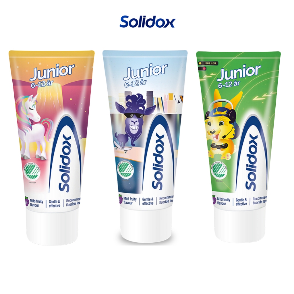 - Sử dụng kem đánh răng Solidox Junior ít nhất hai lần mỗi ngày, sau khi ăn sáng và trước khi đi ngủ.