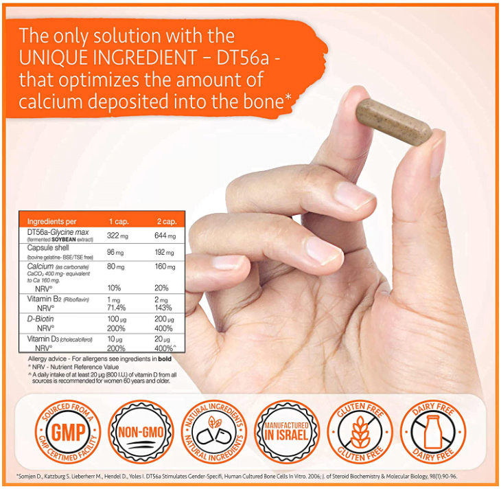 Sản phẩm chứa DT56a, thúc đẩy việc tạo xương mới, đó là thành phần duy nhất ngăn chặn mất canxi xương sau mãn kinh thông qua quá trình tạo xương mới. Mật độ xương tăng nhờ hoạt động này, bằng cách tạo xương mới và khôi phục hoạt động của tế bào tạo xương. Kết hợp canxi và vitamin D3, giúp bảo vệ xương trong giai đoạn mãn kinh của phụ nữ.