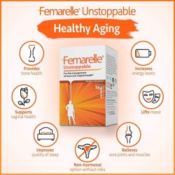 Femarelle Unstoppable – Tối ưu hóa việc tích tụ canxi vào xương sau thời kỳ mãn kinh bằng cách tăng cường khả năng hấp thụ canxi, cải thiện mật độ xương và quản lý các triệu chứng sau mãn kinh như loãng xương, khô âm đạo, tái phát viêm âm đạo-đường tiểu, đau cơ khớp, mất ngủ và trầm cảm.